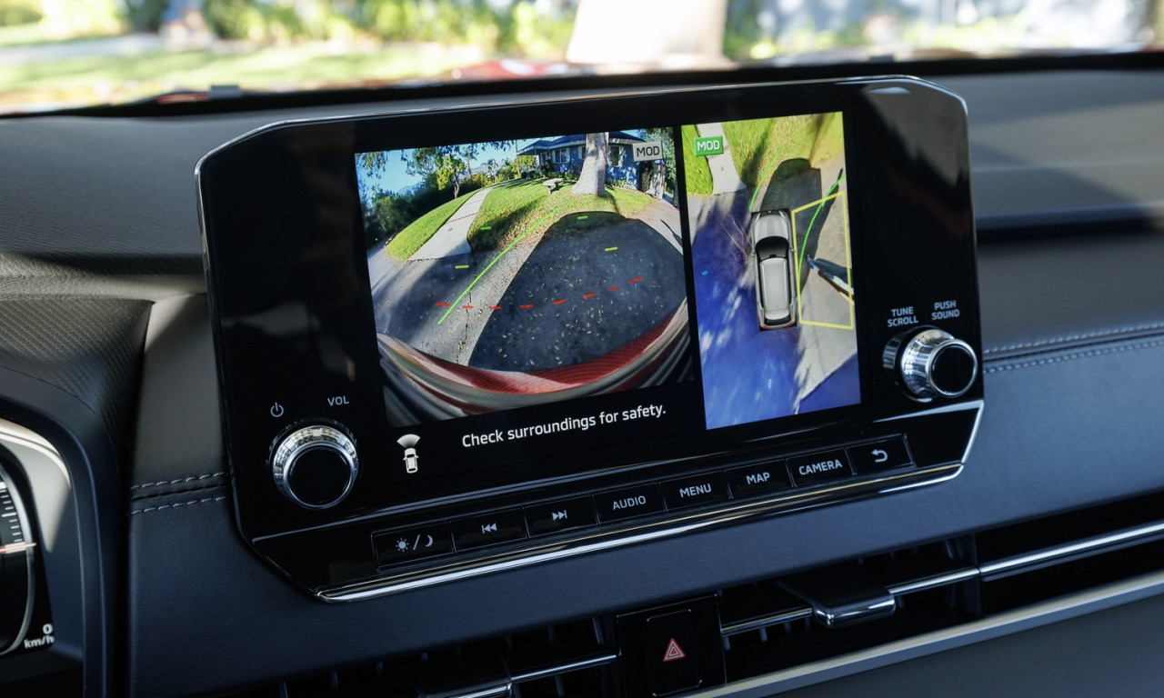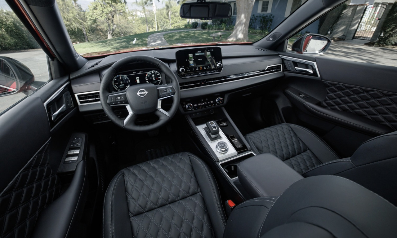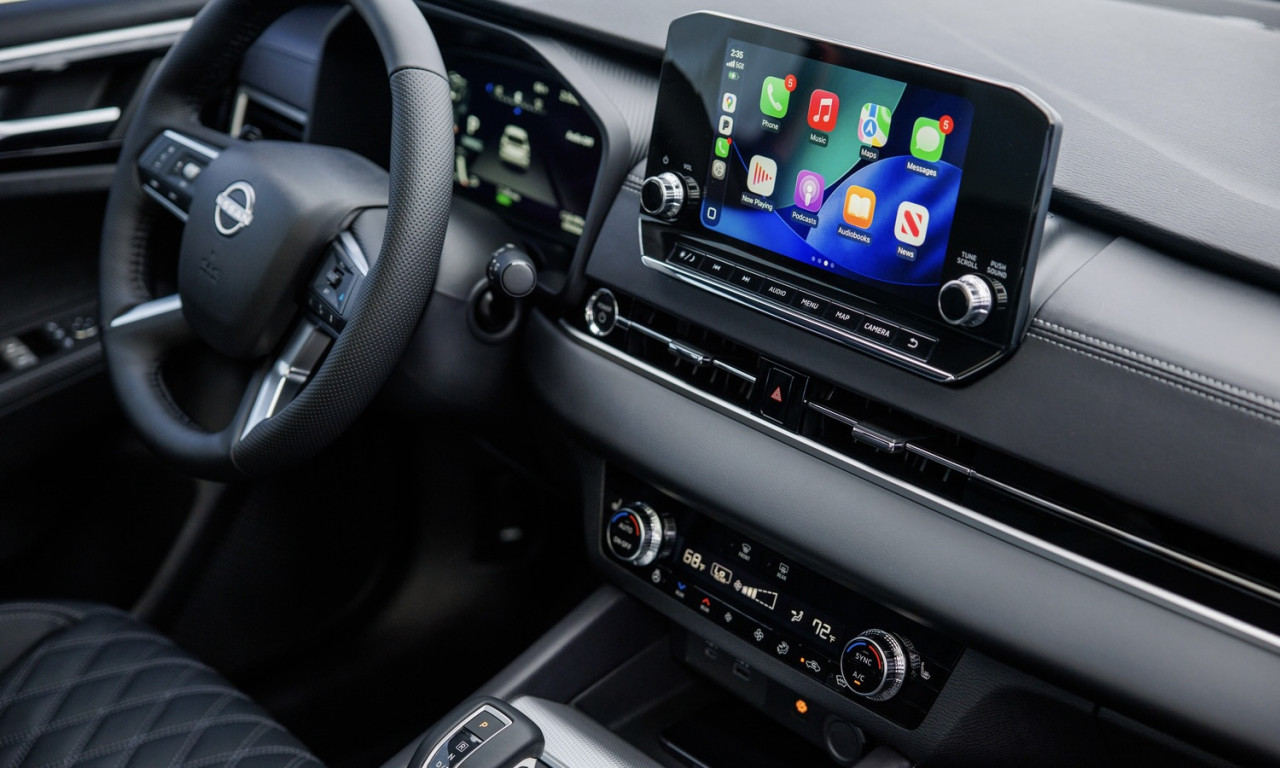 Кабината предлага седем места в три реда. Стандартно се монтира 12,3-инчов цифров приборен блок и 9-инчов централен дисплей с безжичен Apple CarPlay и кабелен Android Auto. Опциите включват 10-инчов Head-Up Display, аудиосистема Bose с девет високоговорителя и тризонен климатик. Пакетът Nissan Safety Shield 360 носи автоматично аварийно спиране, асистент за лента, адаптивни дълги светлини, монитор за мъртва точка и кръстосан трафик отзад. ProPILOT Assist 1.1 подпомага завиване, ускорение и спиране на магистрала, а защитата се допълва от 11 въздушни възглавници.