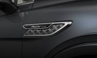 Външността на Bentayga Atelier Edition се отличава с вертикална хромирана решетка и втора решетка в отенък Hallmark Satin. Предните и задните брони също са в този финиш, придавайки елегантен и характерен вид. Специално проектираните 22-инчови алуминиеви джанти с десет спици и детайли в Tungsten Satin допълват характера му.