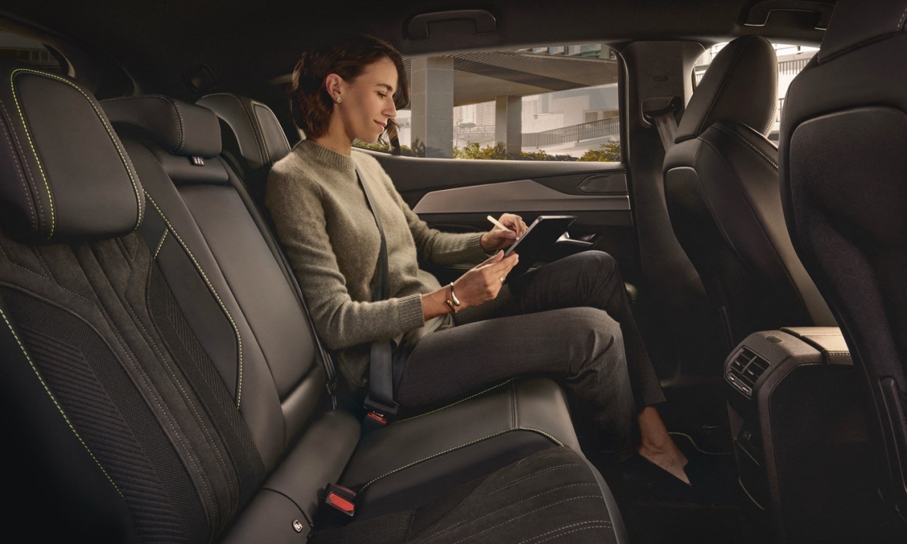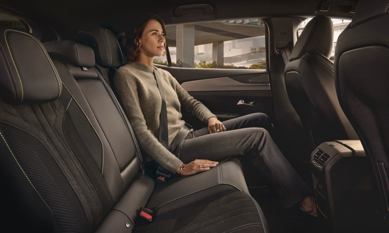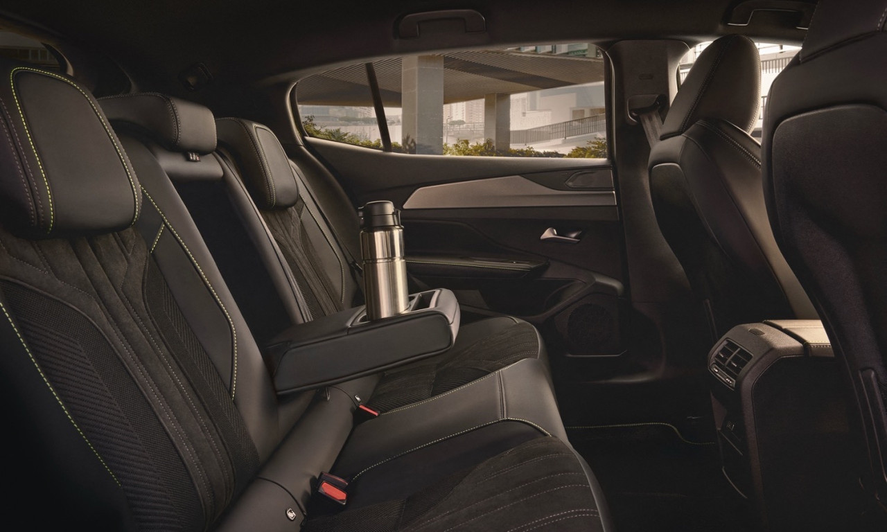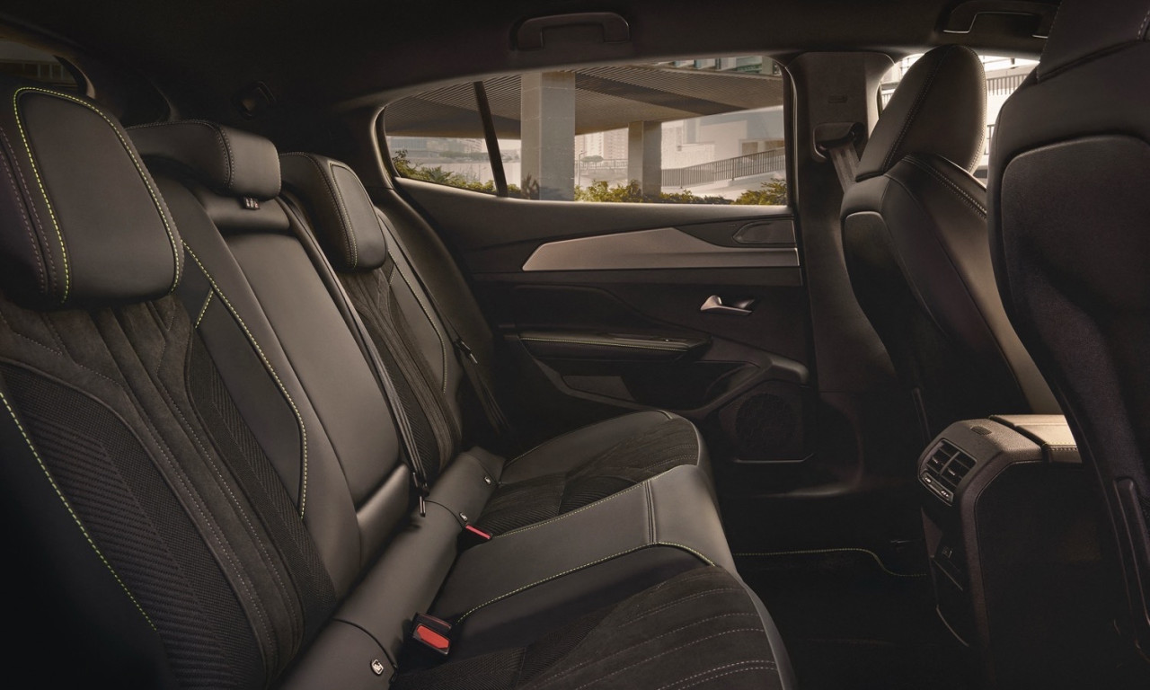 Интериорът следва добре познатата философия Peugeot i-Cockpit – компактен волан, повдигнат приборен панел и 10-инчов дигитален дисплей с нови графики и 3D ефект при по-високите нива. Централният сензорен екран остава ориентиран към водача и работи с конфигурируемите i-Toggles за бърз достъп до основни функции. В купето се залага на по-качествени материали като Alcantara, алуминиеви елементи и кожа Nappa според изпълнението, както и амбиентно осветление с осем цвята. AGR сертифицираните предни седалки могат да бъдат оборудвани с масаж, отопление и електрически настройки. На втория ред има добро място за коленете, макар че падащата линия на покрива може да ограничи пространството за глава при по-високи пътници.