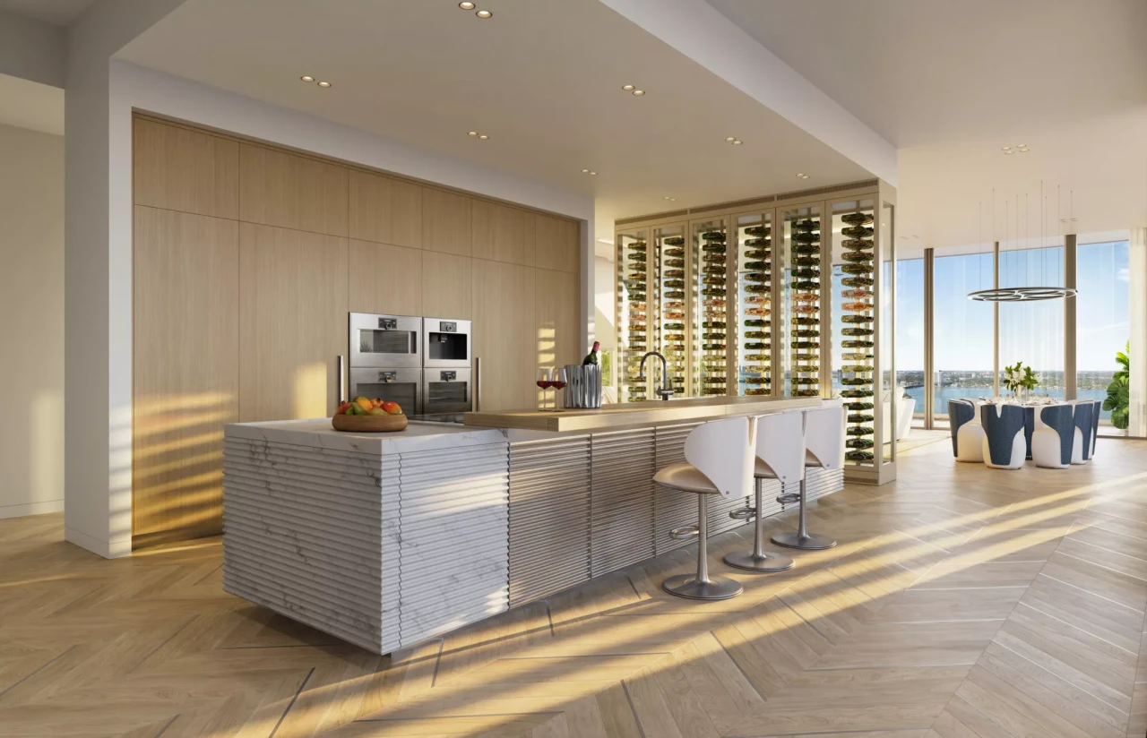 Всеки пентхаус заема 28-ия и 29-ия етаж. Таваните са високи 13 фута, а личен асансьор стига директно до антрето. Обгръщащите тераси разкриват панорама към Biscayne Bay и силуета на Маями.