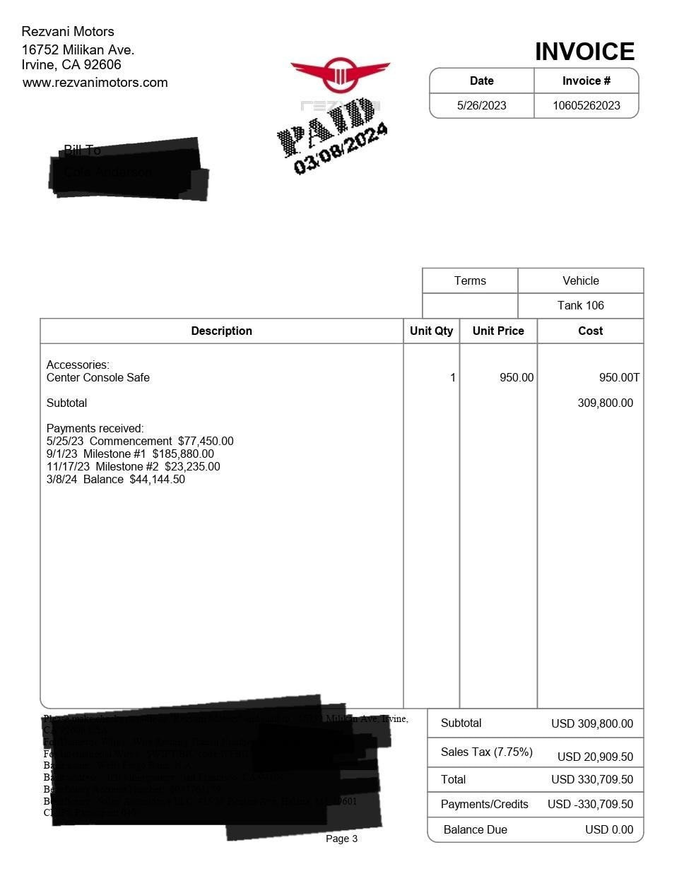 При описването за продажба Rezvani Tank е бил с пробег 9 700 мили (15 600 км). Това води до изчисление, че всяка измината миля е струвала на продавача малко над 16 долара, без да се включват разходите за поддръжка, гориво и други.