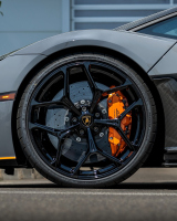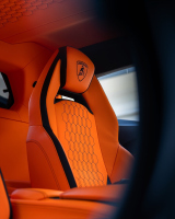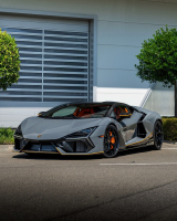 Показаният Lamborghini Revuelto впечатлява с агресивен стил, но всички елементи са напълно заводски. Купето носи боя Grigio Aleno с акценти Arancio Livrea Lucido. Черен покрив, огледала и отделни карбонови детайли допълват визията. Гланцираните черни джанти крият яркооранжеви апарати.