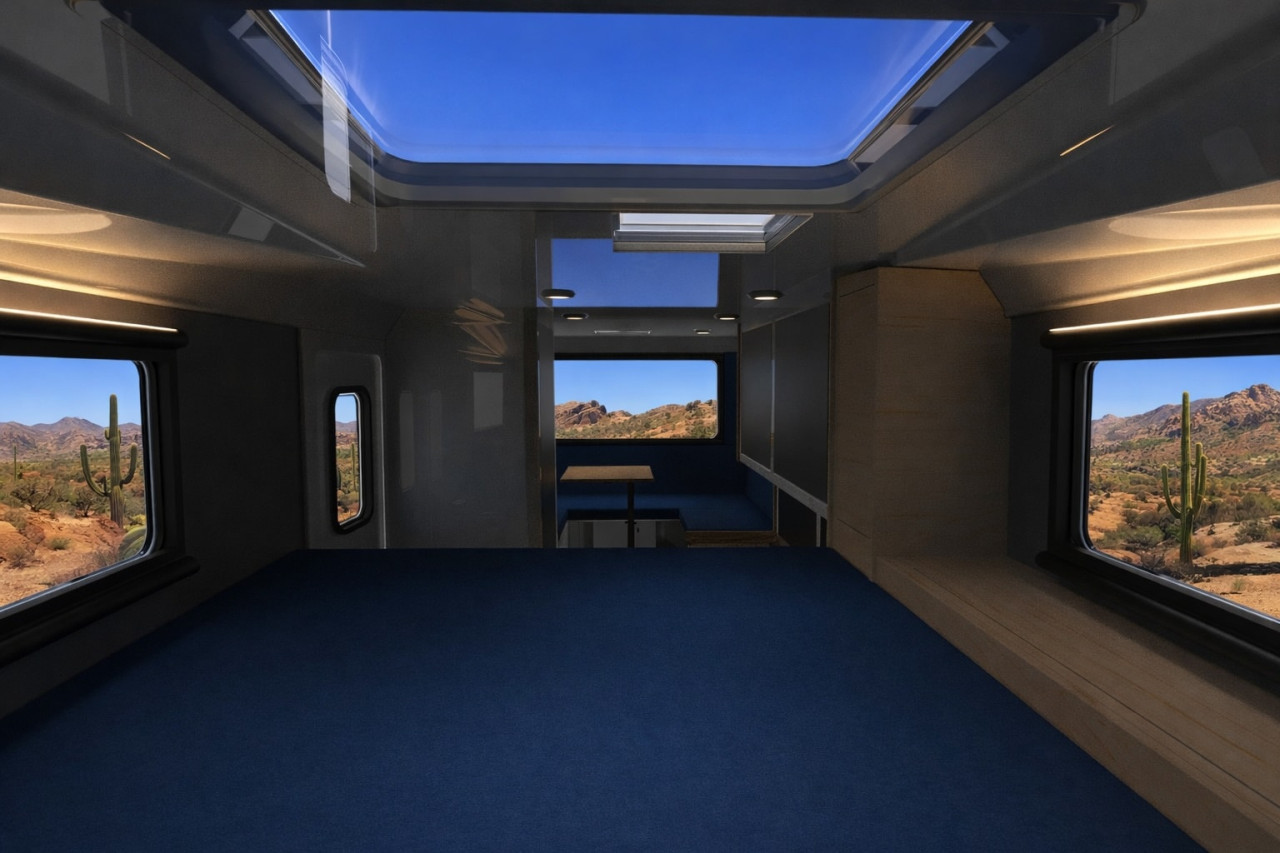 Практичен детайл е страничният заден гараж, предвиден за къмпинг оборудване или дори електрически велосипеди. На покрива Paragon разполага с до 1 460 вата соларни панели, от които 660 вата са стационарно монтирани. Енергията се съхранява в батерии с капацитет до 1 080 амперчаса, допълнени от 100-амперно DC-DC зарядно и инвертор с мощност 3 000 вата – конфигурация, подходяща за продължителен престой извън електрическата мрежа.
