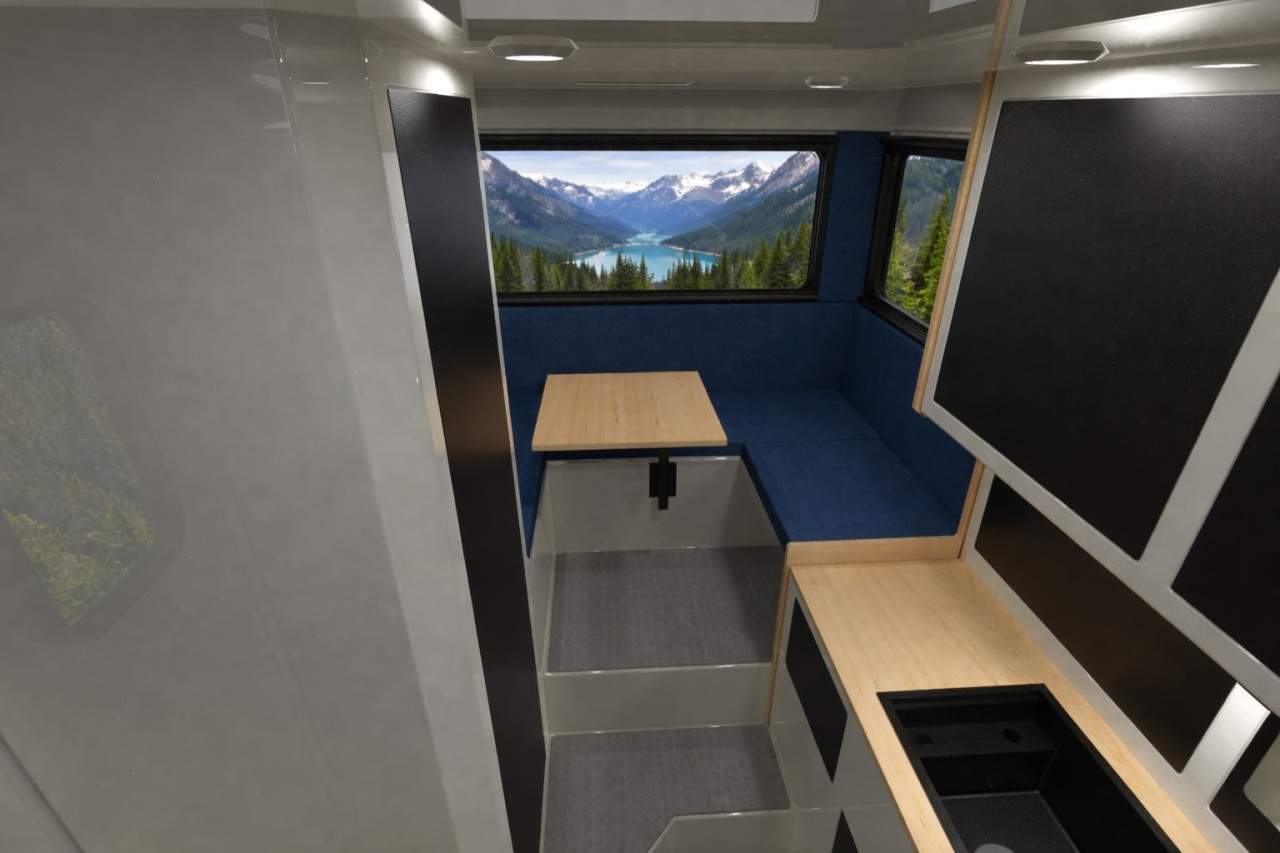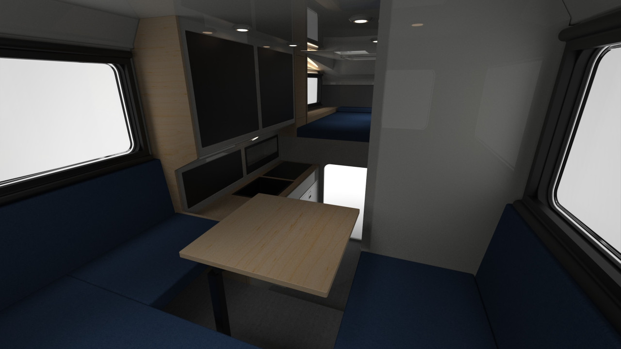 Тъй като модулът е проектиран конкретно за F-350, е осигурен пълен вътрешен проход между кабината и жилищната част, разположен под леглото над кабината. Външният достъп става чрез интегрирана странична врата.