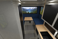 Разпределението включва легло над кабината, комбинирана баня с тоалетна и душ отляво след входа, както и кухненски блок отдясно с индукционен котлон – решение, което елиминира нуждата от газова система. В задната част е разположен салон с модулна трапезария, която може да бъде конфигурирана като U-образна, L-образна или да се трансформира в допълнително легло. Осветлението и вентилацията се подпомагат от панорамни двукамерни прозорци Arctic, включително над основното легло.