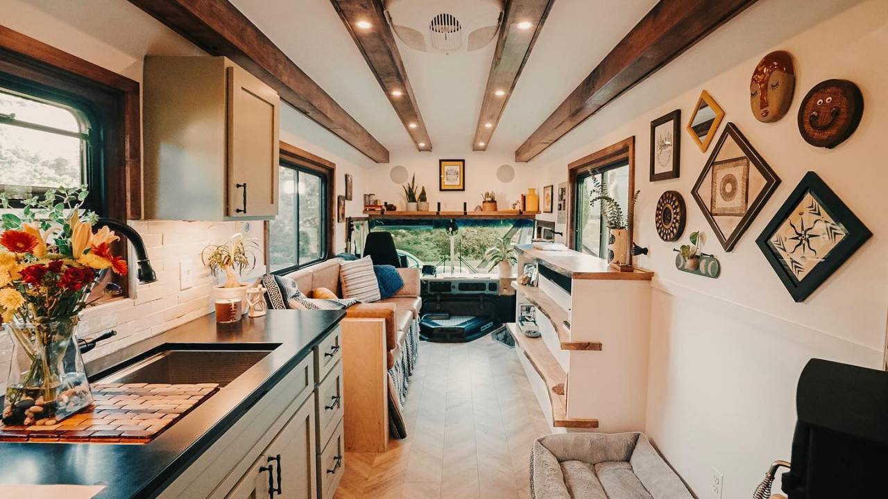 Пандемията от COVID доведе до ново ниво на популярност на животa на колела, като през това време видяхме впечатляващи самостоятелни преобразования на автобуси. Едно от тях е дело на Джонатан Перера, който не се е спестил усилия. Той не само е създал уютен интериор, но и е повдигнал покрива с почти два фута, за да започне трансформацията си. Днес този стилен караван с повдигнат покрив изглежда много различен от жълтия училищен автобус Bluebird, който беше в началото.
