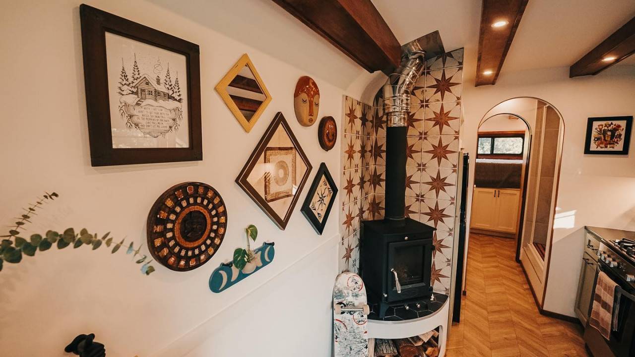 Вътрешността на каравана също е впечатляваща. Дизайнат започва с редици от рафтове от страната на пътниците, стратегически поставени за функция като развлекателен център и бюро за работа на стоеж. Срещу тях има сгъваема маса, която може да послужи на шест души за хранене. Кухнята изглежда по-голяма от някои жилищни комплектации и е оборудеана с уреди в реален размер и достатъчно място за плот. И да, има и действаща дървена печка за отопление, която Перера използва през зимата на височина от 3,048 метра в планините.