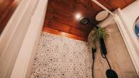 Банята е разположена между кухнята и спалнята, разделена от коридора. Стойната душ кабина е проста, но елегантна, а тоалетната е в отделна част. Автобусът разполаг за прясна вода, който побира 379 литра.