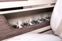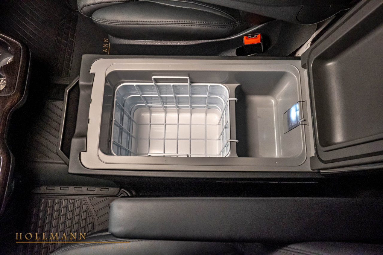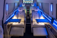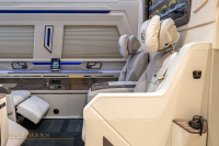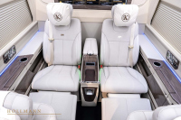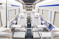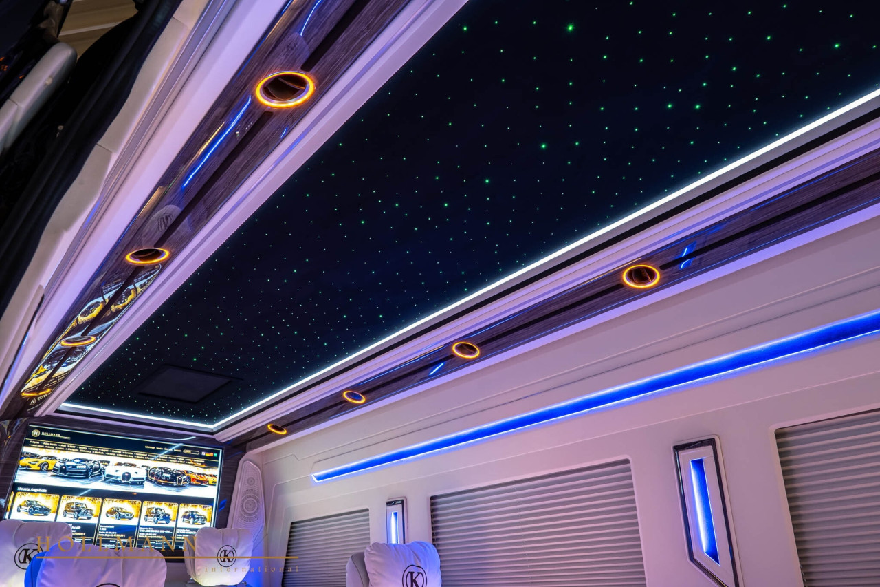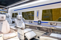 Автоматична степенка улеснява достъпа, а вътре ви посрещат шест индивидуални кресла. Те предлагат масаж, отопление и вентилация. Между тях има сгъваеми масички, две 32-инчови телевизии, амбиентно осветление, щори за поверителност и бар. Добавени са стъклени държачи, отделения за съхранение, iPad, звездно небе на тавана и допълнителна изолация.